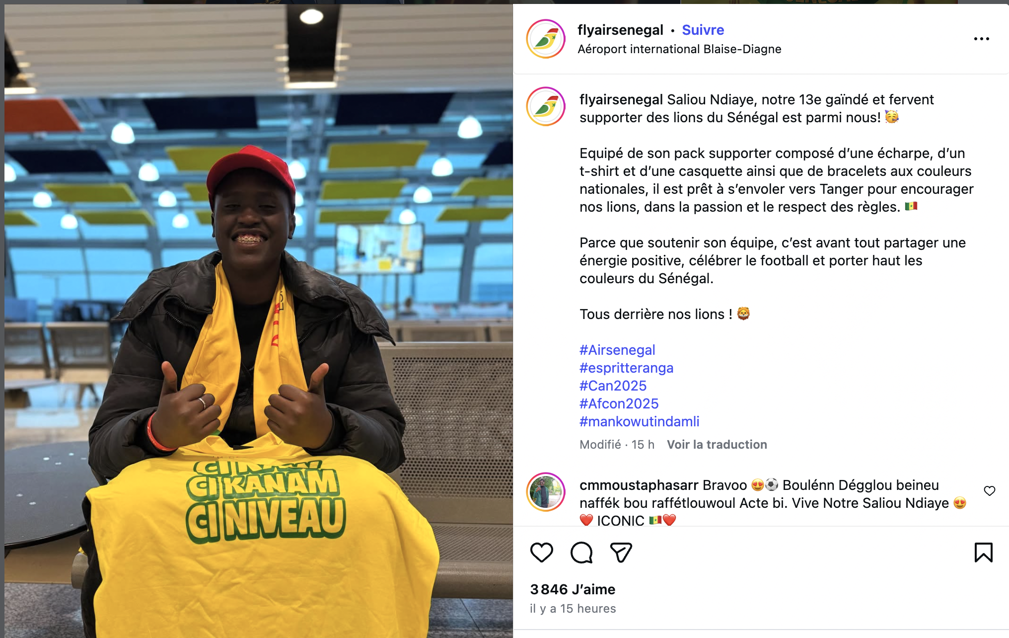 ونشرت الشركة السنغالية صوراً للمشجع “نداي” وهو يستعد للإقلاع صوب مطار طنجة ابن بطوطة، حيث ظهر مجهزاً بحزمة تشجيعية كاملة تضم قميصاً وقبعة ووشاحاً بألوان العلم الوطني السنغالي. كما أكدت المؤسسة، في بلاغها الرسمي، أن استقدام هذا المشجع يأتي لضخ طاقة إيجابية في صفوف الجماهير السنغالية المتواجدة بالمغرب، مع التشديد في الوقت ذاته على ضرورة الالتزام بـ”الروح الرياضية” واحترام قواعد اللعبة والضوابط التنظيمية المعمول بها داخل الملاعب المغربية لتجنب أي عقوبات قد تطال البعثة المشجعة.