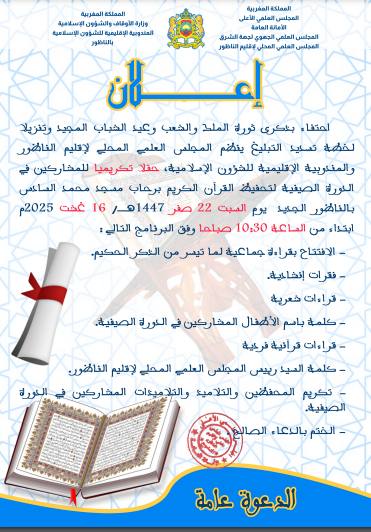المجلس العلمي للناظور يكرم المشاركين في الدورة الصيفية لتحفيظ القران الكريم يوم السبت بمسجد محمد السادس بالناظور الجديد ابتداء من الساعة العاشرة و النصف صباحا..